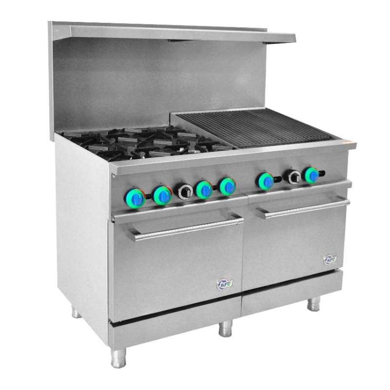 This range has the feature of sturdy construction for commercial cooking applications demanding, user-friendly operation with the simple controls and easy to clean. A combination of 4 open top burners, 24" charbroiler, and 2 spacious ovens make this natural gas range a tremendous asset to your commercial kitchen! You can perform a variety of cooking tasks while getting the most valuable floor space. This oven provides you with a convenient way to warm your delicious foods or even do a bit of baking for your dessert menu!