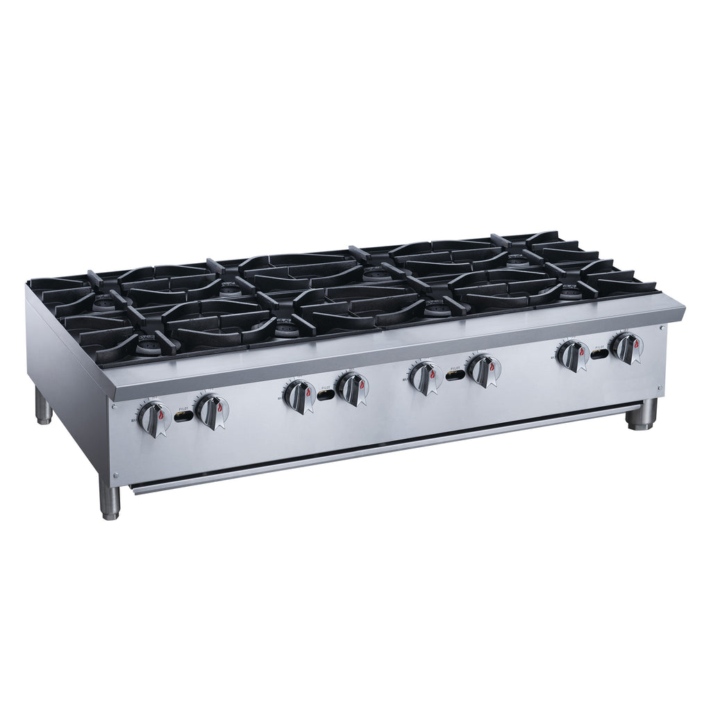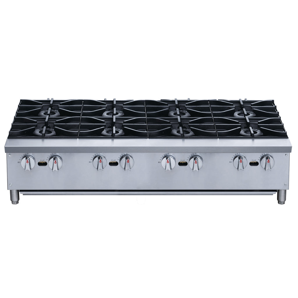The Chef AAA TCHPA48 Hot Plate is designed to meet the demands of high-volume cooking environments with its eight burners, collectively producing an impressive 224,000 BTU/H output. Its stainless steel construction ensures durability and easy maintenance both internally and externally. Each burner, delivering 28,000 BTU stainless steel power with standby pilot, offers reliable and efficient heating, while independent manual controls every 12 inches allow for precise temperature adjustments. Featuring adjustable stainless steel legs for stability, lift-off cast iron burners, and a full-length seamless drip pan for hassle-free cleaning, this hot plate is built for convenience. Shipped with options for both Standard Natural Gas and LP conversion kits, it accommodates various gas sources. With a "cool-to-the-touch" front stainless steel edge and backed by a 1-year parts and labor warranty, the TCHPA48 is a reliable choice for commercial kitchens.