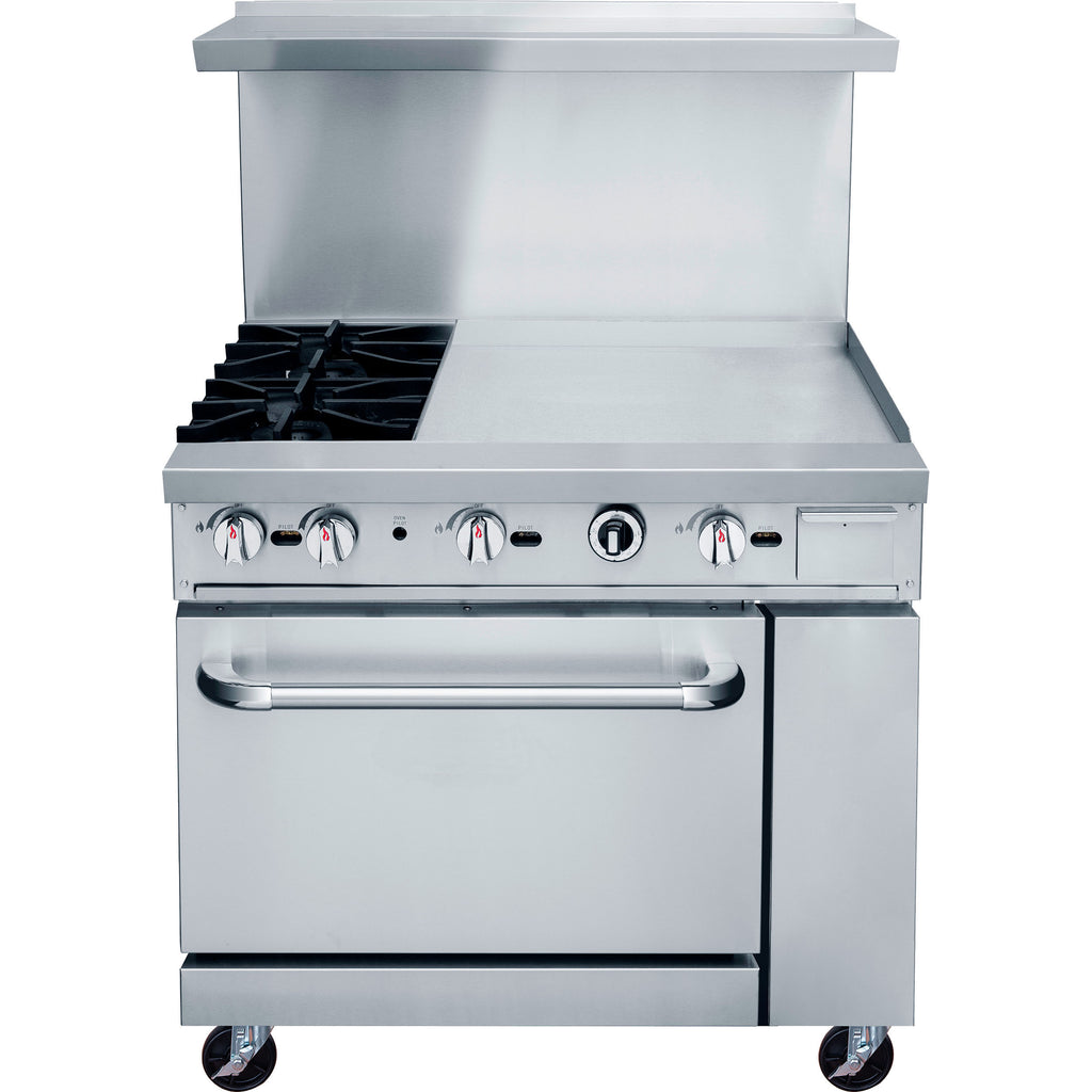 The Chef AAA TCR36-2B24GM 36" Gas Range with Two (2) Open Burners & 24" Griddle is a versatile and durable cooking appliance designed for commercial kitchens. Featuring a stainless steel exterior on all sides, including the front, back, kick plate, back guard, and over shelf, it ensures durability and easy maintenance. The heavy-duty 12” x 12” removable, 3/4" steel plate griddle provides even heat distribution for consistent cooking results, while the oven offers a temperature range from 175°F to 500°F for versatile cooking options. Standard features include a 3/4” NPT rear gas connection and regulator, two chrome oven racks per oven with multiple position oven rack guides, and an enamel interior oven for effortless cleaning. Equipped with 6" casters with locks, this range offers easy mobility, making it ideal for busy commercial environments.