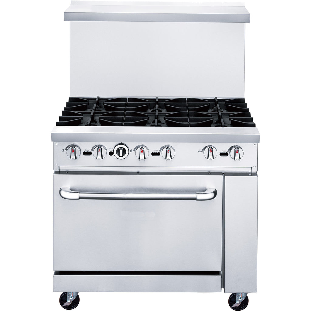 The Chef AAA TCR36-6B 36" Gas Range with Six (6) Open Burners is designed for high-performance cooking in commercial kitchens. Its stainless steel exterior, covering the front, back, sides, kick plate, back guard, and over shelf, ensures durability and easy cleaning. The heavy-duty 12” x 12” removable, 3/4" steel plate provides robust cooking surface, while the oven offers a temperature range of 175°F to 500°F for versatile cooking options. Standard features include a 3/4” NPT rear gas connection and regulator, two chrome oven racks per oven with multiple position oven rack guides, and an enamel interior oven for effortless cleaning. With 6" casters equipped with locks, this gas range offers convenient mobility for dynamic kitchen environments.