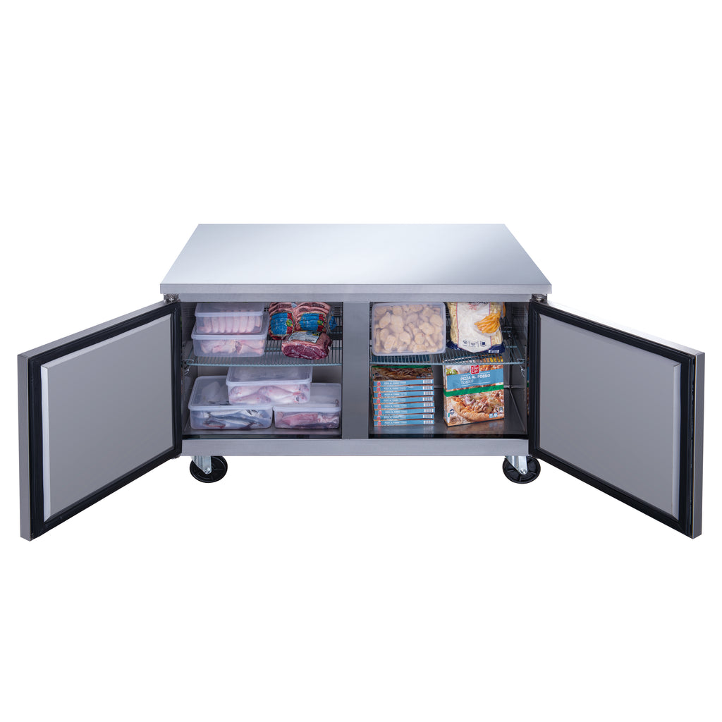 The Chef AAA - TUC48R undercounter refrigerator has a spacious capacity and all over brushed stainless steel construction. With a range of 33 to 41°F it chills and safely stores all type of food. Digital temperature controls and LED display lets you precisely pick the desired temperature. Designed with a bottom mounted 1/5 HP compressor for efficiency. Includes 2 adjustable and removable wire shelves.