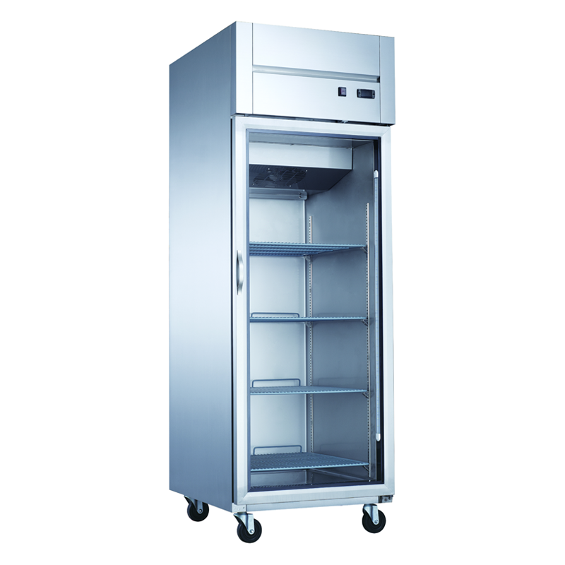 The Dukers D28AR-GS1 reach-in commercial refrigerator is designed to suit the needs of any business who needs optimal performance without sacrificing design. A single glass door is accented with high-quality brushed stainless steel for both the interior and exterior to fit a variety of decors. The heavy-duty 1/5 HP compressor is top mounted for excellent efficiency and better cooling. Digital controls fine-tune the desired interior temperature. Self-closing doors free up your hands for added convenience and ease of use. Auto-defrosting provides lower energy costs and colder temperatures. Four shelves can be adjusted or removed for flexibility and maintenance. Easily move and position with four swivel casters.