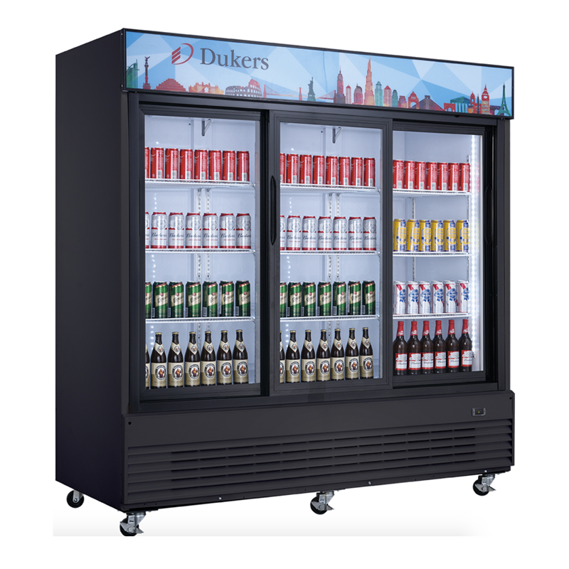 The Dukers DSM-68SR 69 cubic feet commercial display cooler refrigerator offers ample room for all types of drinks and beverages. Three sliding tempered glass doors with anti-fogging technology keeps your merchandise front and center for all browsing customers. The included 6 casters allow easy positioning and can be locked for security. R290 natural refrigerant is used for fast and more efficient cooling than traditional Freon.