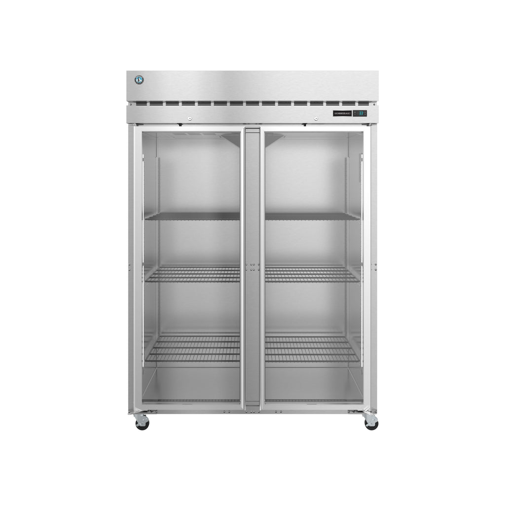 Providing impressive performance and dependable durability, this Hoshizaki R2A-FG 55" glass door reach-in refrigerator is engineered to hold your refrigerated ingredients in a safe environment. Designed with a stainless steel interior with a stainless steel exterior front, sides, and top, the unit features a sleek appearance and the ability to withstand busy, heavy use in commercial kitchens. The stainless steel construction looks great and is also easier for your employees to maintain during the hustle and bustle of their daily tasks.