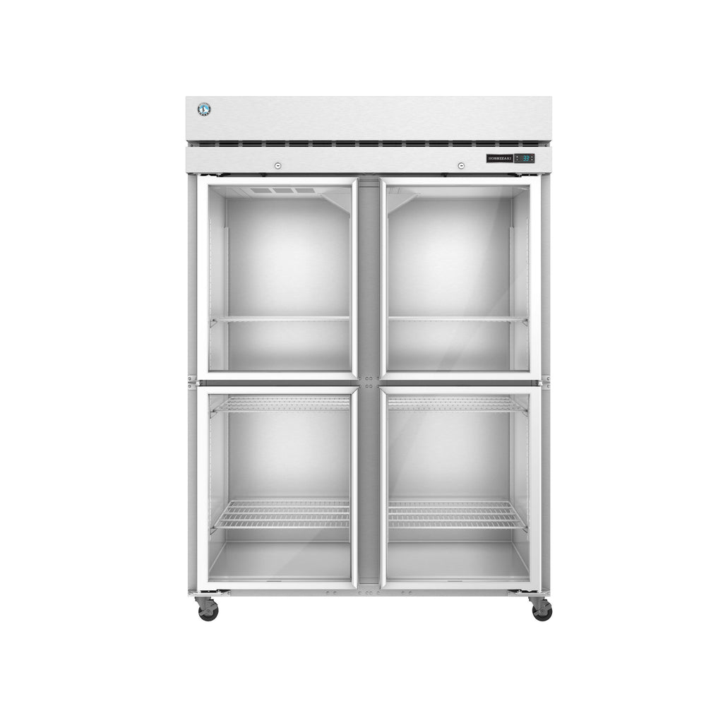 Providing impressive performance and dependable durability, this Hoshizaki R2A-HG 55" half glass door reach-in refrigerator is engineered to hold your refrigerated ingredients in a safe environment. Designed with a stainless steel interior with a stainless steel exterior front, sides, and top, the unit features a sleek appearance and the ability to withstand busy, heavy use in commercial kitchens. The stainless steel construction looks great and is also easier for your employees to maintain during the hustle and bustle of their daily tasks.