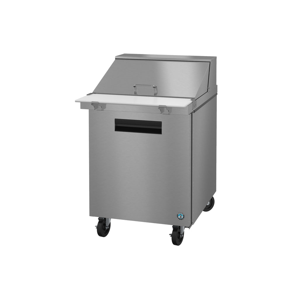 Optimize your back-of-house operations with this Hoshizaki SR27B-12M 27" mega top prep refrigerator with 1 door. Whether you need to streamline service in a cafeteria, sub shop, or independent restaurant, this heavy-duty, stainless steel unit is made to facilitate the sandwich or salad prep process. Its mega top holds up to (12) 1/6 size food pans, 4" deep, and it comes with a full set of clear plastic pans to get you started. The pan rail can also accept 6" deep pans (sold separately).