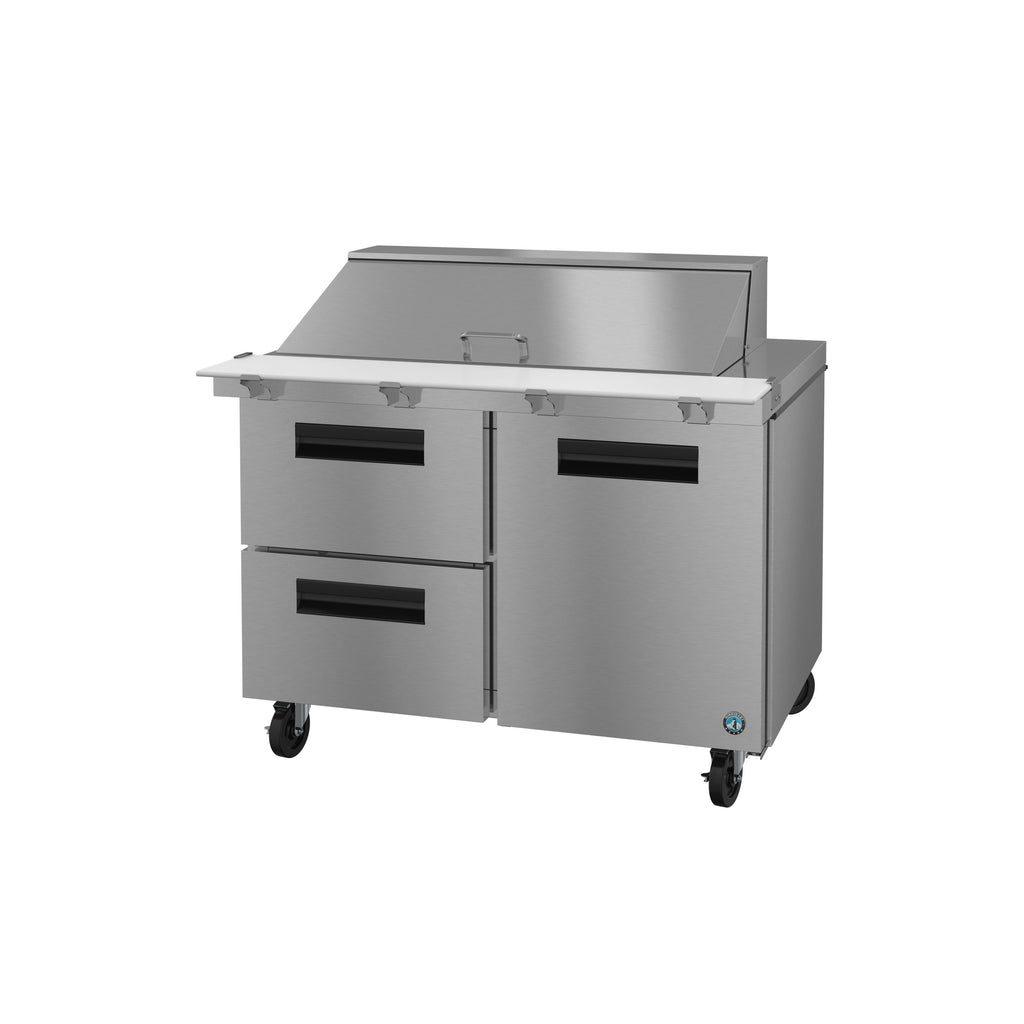 Optimize your back-of-house operations with this Hoshizaki Steelheart B Series SR48B-18MD2 48" 2 drawer 1 door stainless steel refrigerated sandwich prep table. Whether you need to streamline service in a cafeteria, sub shop, or independent restaurant, this heavy-duty, stainless steel unit is made to facilitate the sandwich or salad prep process. The mega top holds up to (18) 1/6 size food pans, 4" deep, and it comes with a full set of polycarbonate plastic pans to get you started. The pan rail can also accept 6" deep pans (sold separately).