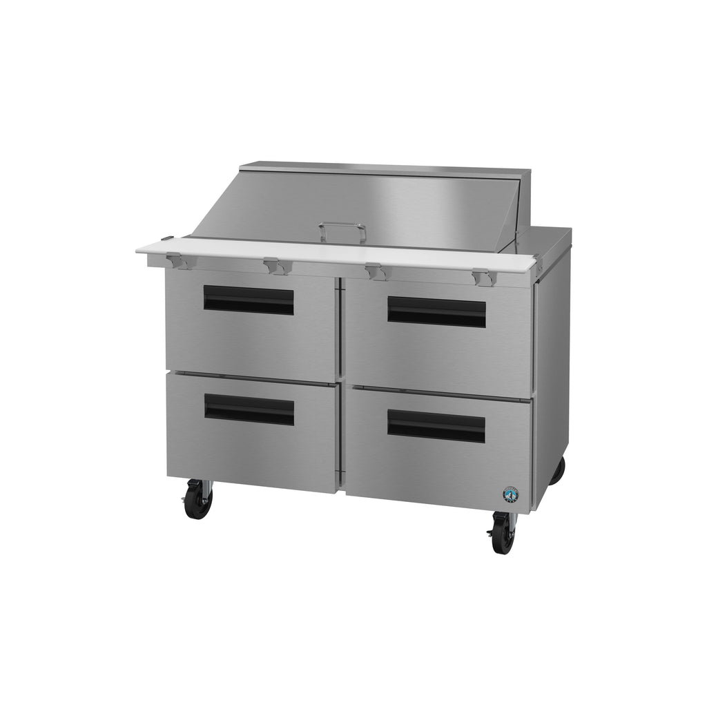 Optimize your back-of-house operations with this Hoshizaki Steelheart B Series SR48B-18MD4 48" 4 drawer mega top stainless steel refrigerated sandwich prep table. Whether you need to streamline service in a cafeteria, sub shop, or independent restaurant, this heavy-duty, stainless steel unit is made to facilitate the sandwich or salad prep process. The mega top holds up to (18) 1/6 size food pans, 4" deep, and it comes with a full set of polycarbonate plastic pans to get you started. The pan rail can also accept 6" deep pans (sold separately).