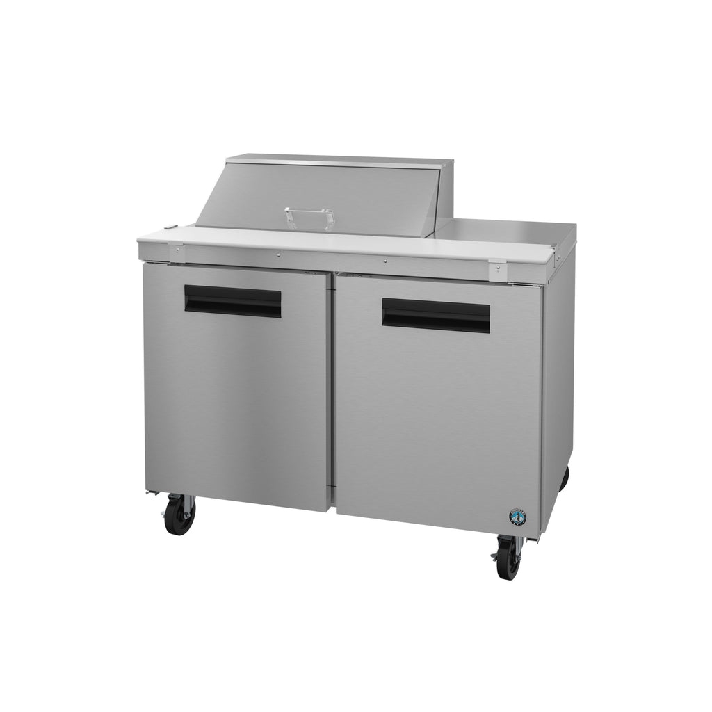Optimize your back-of-house operations with this Hoshizaki Steelheart B Series SR48B-8 48" 2 door stainless steel refrigerated sandwich prep table. Whether you need to streamline service in a cafeteria, sub shop, or independent restaurant, this heavy-duty, stainless steel unit is made to facilitate the sandwich or salad prep process. The top rail holds up to (8) 1/6 size food pans, 4" deep, and it comes with a full set of polycarbonate plastic pans to get you started. The pan rail can also accept 6" deep pans (sold separately).