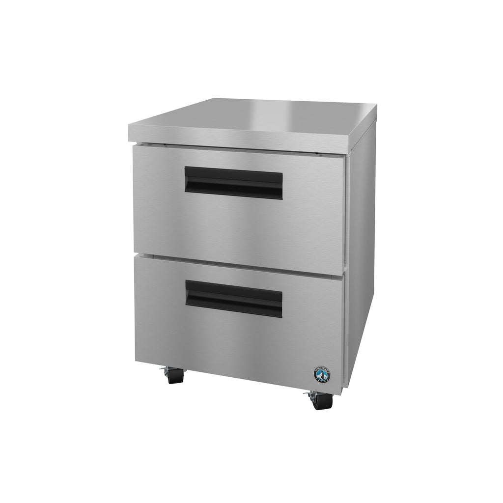 Streamline food preparation with the Hoshizaki UR27B-D2 27" undercounter refrigerator. Featuring a spacious stainless steel work surface for slicing, dicing, assembling, and mixing, this heavy-duty unit is made to simplify prep and cold storage. It's designed without a backsplash, so it can conveniently fit underneath a counter in your workstation without taking up extra space.