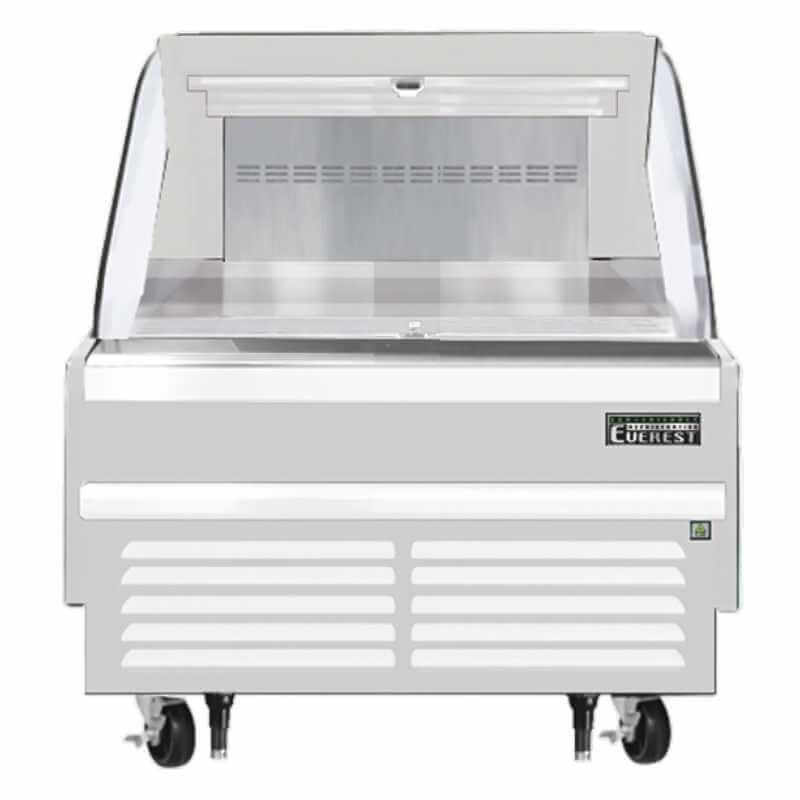 The evaporator coils and condenser are large capacities and corrosion-resistant. The fan motors are electronically commutated and can achieve rapid cooling with less energy consumption. There is also shielded LED bar lighting, located under shelves and the canopy, which provides high color illumination with low heat output. The factory preset temperature is 35°F. The two-tier shelf riser is removable.