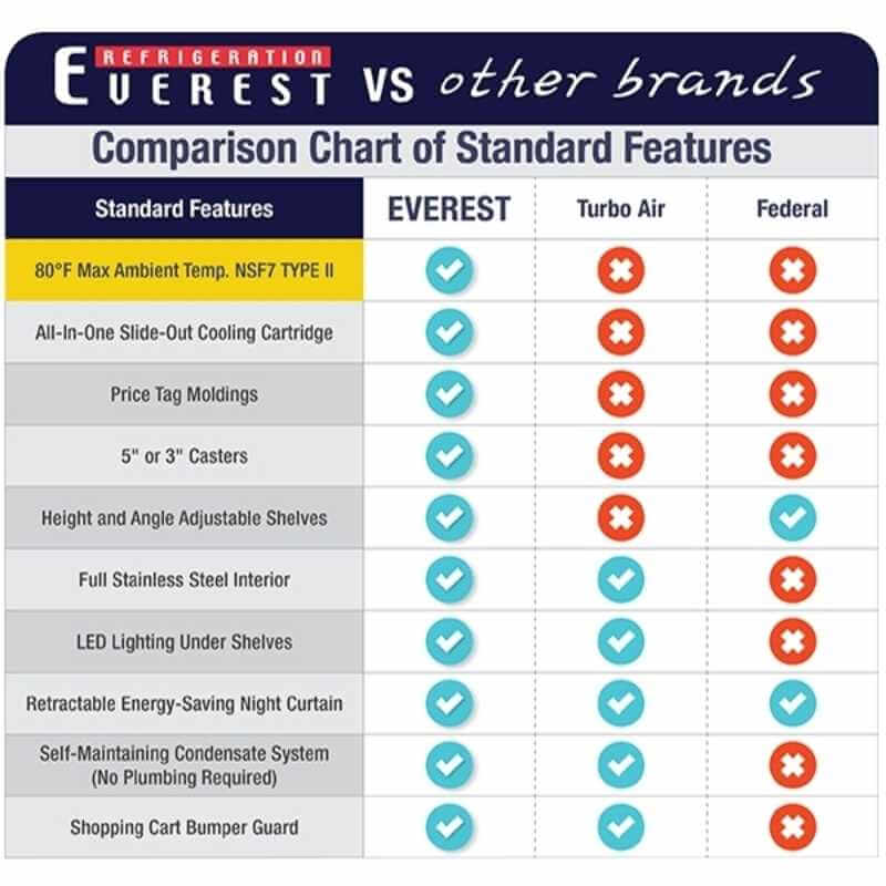 The evaporator coils and condenser are large capacities and corrosion-resistant. The fan motors are electronically commutated and can achieve rapid cooling with less energy consumption. There is also shielded LED bar lighting, located under shelves and the canopy, which provides high color illumination with low heat output. The factory preset temperature is 35°F. The two-tier shelf riser is removable.