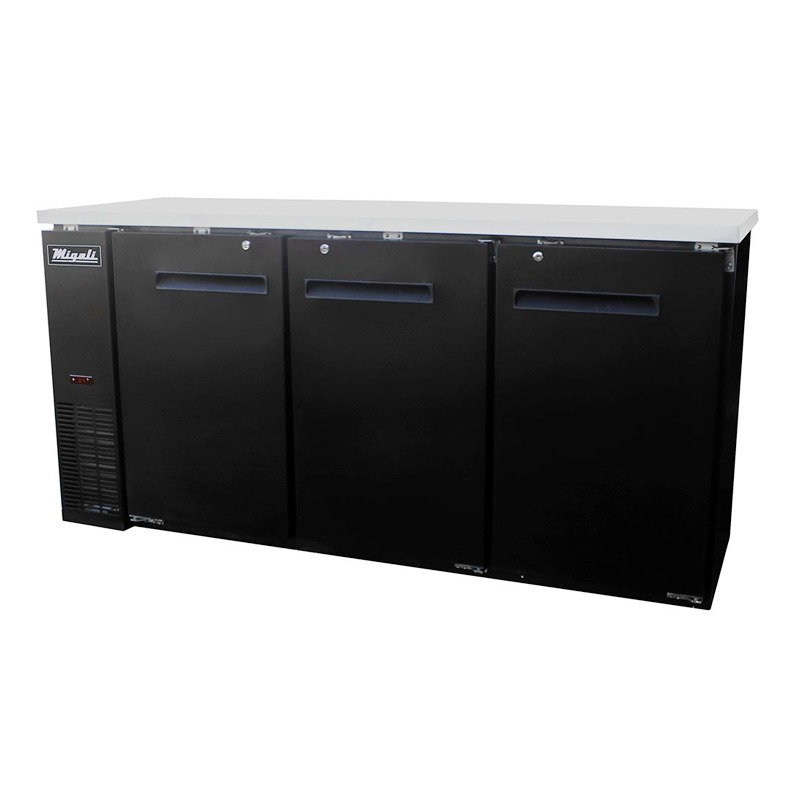 The Migali® C-BB72-HC back bar refrigerator is a great addition to any bar, restaurant, or man cave. The all-black exterior, stainless steel top, and stainless steel interior provide a minimalist appearance that is both attractive and durable. This series is engineered with a robust forced-air refrigeration system for cold, uniform temperatures throughout the interior, keeping your beverages at an average temperature of 36°F. The C-BB72-HC incorporates a digital controller and temperature read-out for improved temperature consistency, increased energy efficiencies, and top-of-the-line performance. Lastly, this unit is built with a state-of-the-art, hydrocarbon refrigeration system which reduces energy consumption by up to 40% (when compared to traditional freons 134a and 404a). This in turn saves you money on your monthly electric bill, greatly reduces your overall cost of ownership, and finally helps fight climate change by drastically reducing the refrigerator’s carbon footprint.