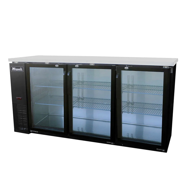 The Migali® C-BB72G-HC glass door back bar refrigerator is a great addition to any bar, restaurant or man cave. The all black exterior, stainless steel top and stainless steel interior provides a minimalist appearance that is both attractive and durable. The interior includes LED lightings for a bright attractive display. This series is engineered with a robust forced air refrigeration system for cold, uniform temperatures throughout the interior, keeping your beverages at an average temperature of 36°F. The C-BB72G-HC incorporates a digital controller and temperature read-out for improved temperature consistency, increased energy efficiencies and top-of-the-line performance. Lastly, this unit is built with a state-of-the-art, hydrocarbon refrigeration system which reduces energy consumption up to 40% (when compared to traditional freons 134a and 404a). This in turn saves you money on your monthly electric bill, greatly reduces your overall cost of ownership and finally helps fight climate change by drastically reducing the refrigerator’s carbon footprint.
