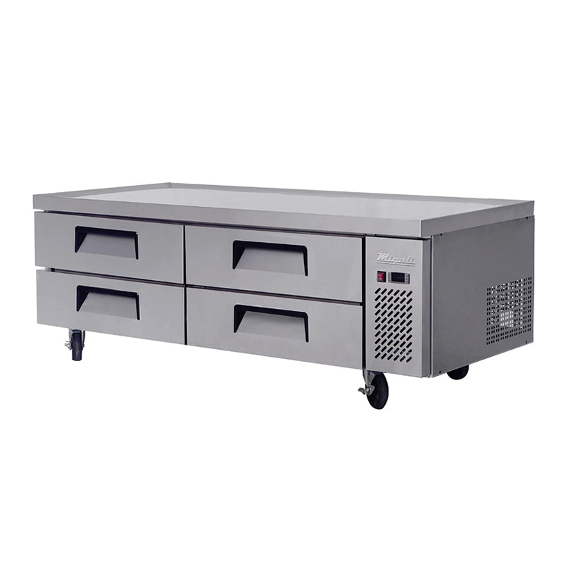 The Migali® C-CB72-76 refrigerated chef base is designed to enhance your cooking efficiencies. The refrigerated drawer section allows for up to (24) 1/6th size pans of storage space while the expanded 76” top is designed to hold up to 1,084 lbs of countertop cooking equipment. This series is also engineered with a robust forced-air refrigeration system for cold, uniform temperatures throughout the chef base’s interior. The C-CB72-76 incorporates a digital controller and temperature read-out for improved temperature consistency, increased energy efficiencies, and top-of-the-line performance. Lastly, this unit is equally eye-catching and ergonomic, boasting a high polished stainless steel exterior and interior and recessed drawer handle to maximize workspace.