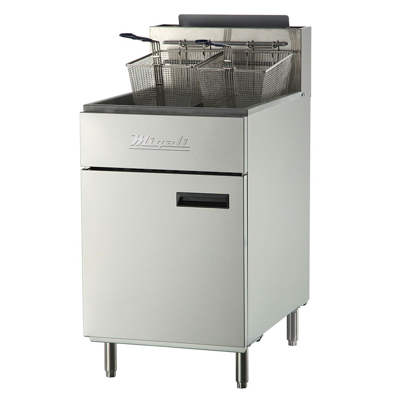The Migali® C-F75-LP commercial liquid propane fryer is great for frying your customer’s favorite apps and entrees. This model is designed with a 75 lb capacity oil tank and includes (2) wire mess chrome baskets. Migali® uses the highest quality components, incorporating a Robert Shaw® brand thermostat for maintaining desired cooking temperatures of up to 400°F /150,000 BTUs. Finally, the C-F75-LP is also eye-catching, boasting a high polished stainless steel exterior and interior, chrome accents, and stainless steel adjustable legs.