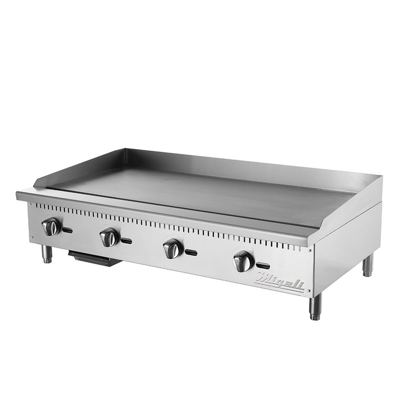 The Migali® C-G48 48″ wide, manual griddle is essential to most commercial kitchens and restaurants. This model is designed with a 20″ deep, 3/4″ thick steel cooking surface and includes (4) chrome temperature knobs. Migali® “U” shape burners are robust, creating an even temperature across the cooking surface. Finally, the C-G48 is also eye catching, boasting a high polished stainless steel exterior and interior, chrome accents and stainless steel adjustable legs.