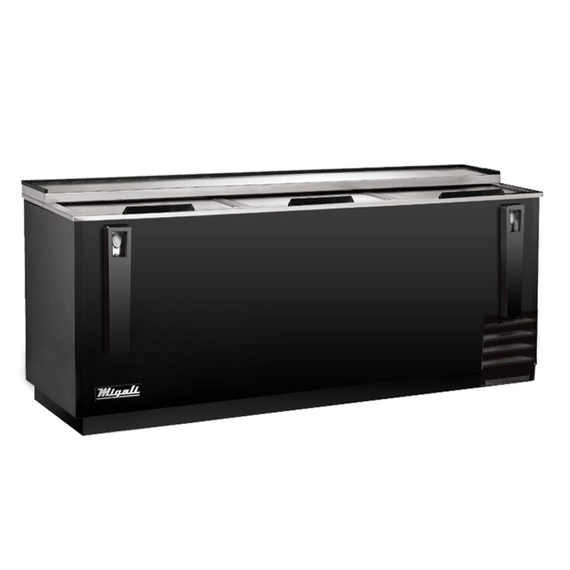 The Migali® C-HCB95-HC horizontal bottle cooler is a great addition to any bar, restaurant, or man cave. The all-black exterior, stainless steel top, and stainless steel interior provide a minimalist appearance that is both attractive and durable. This unit includes (3) sliding lids to access the refrigerated base. Each lid channel is re-enforced with stainless steel to help support the added weight on the top surface. This series is engineered with a robust forced-air refrigeration system for cold, uniform temperatures throughout the interior, keeping your beverages at an average temperature of 36°F. The C-HCB95-HC incorporates a digital controller and temperature read-out for improved temperature consistency, increased energy efficiencies, and top-of-the-line performance. Lastly, this unit is built with a state-of-the-art, hydrocarbon refrigeration system which reduces energy consumption by up to 40% (when compared to traditional Freon's 134a and 404a). This in turn saves you money on your monthly electric bill, greatly reduces your overall cost of ownership, and finally helps fight climate change by drastically reducing the refrigerator’s carbon footprint.