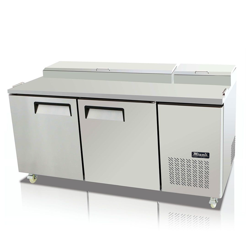 The Migali® C-PP67 pizza prep table is excellent for storing & prepping pizza and sandwich food products. The pizza prep series is designed with a robust forced-air refrigeration system for cold, uniform temperatures throughout the cabinet’s interior and underneath the pan rail. This model also incorporates a digital controller and temperature read-out for greater temperature control, increased energy efficiencies, and top-of-the-line performance. The C-PP67 is equally eye-catching and ergonomic, boasting a high polished stainless steel exterior and interior, rounded door edges, and a recessed door handle. The 20 cubic feet interior is spacious and comes standard with 2 adjustable shelves, however, an optional bun rack for 18″ x 26″ sheet pans or 12″ by 20″ hotel pans will also fit inside the interior’s cavity.