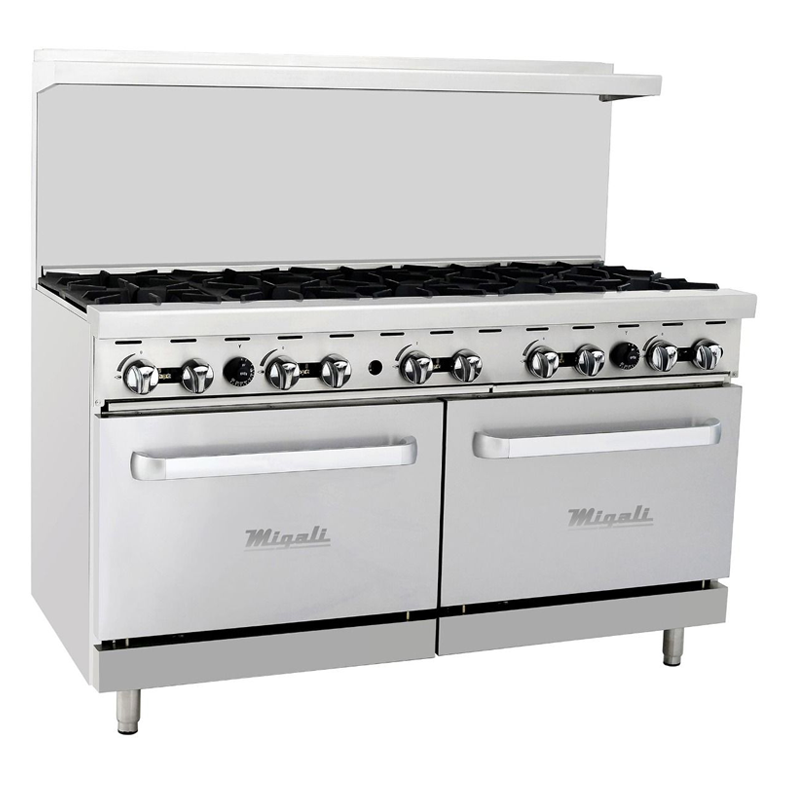The Migali C-RO10-NG gas range has two ovens and ten burners that provide a total output of 305,000 BTU, providing ample heating power to keep up with the dinner rush. Each burner delivers 25,000 BTUs and is manually ignited by a continuous pilot, while the ovens max out at 27,000 BTUs each. Individual burner and oven temperatures are controlled by chrome knobs on the front.