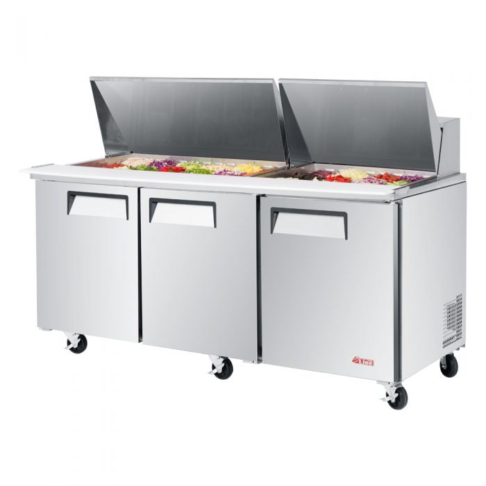 E-line Sandwich/Salad Mega Top Unit, three section, 72-5/8″W x 34″D x 39″H, 23 cu. ft., self-contained refrigeration, (3) solid doors, (3) adjustable PE coated wire shelves, (30) 1/6 size x 4″ deep pan capacity, (2) hoods, cold air compartment, 9-1/2″ deep cutting board with side rail, stainless steel doors, aluminum interior sides with stainless steel back & floor, aluminum exterior (galvanized steel back & bottom), R290 Hydrocarbon refrigerant, 3/8 HP, 115v/60/1-ph, 5.5 amps, NEMA 5-15P, cETLus, ETL-Sanitation (Contact sales for lead time)
