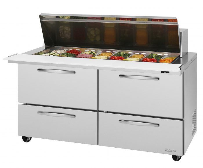 PRO Series Mega Top Sandwich/Salad Prep Table, two-section, 60-1/4″W x 34″D x 39-1/8″H, self-contained refrigeration with self-cleaning condenser, 19.0 cu. ft., capacity, 24-pan top opening with hood, (4) drawers, 9-1/2″ deep cutting board with side rail, digital temperature control & monitor system, cold bunker system, stainless steel interior & exterior (galvanized bottom), LED interior lighting & fan control, R290 Hydrocarbon refrigerant, 1/5 HP, 115v/60/1-ph, 8.9 amps, cord with NEMA 5-15P cETLus, ETL-Sanitation, Made in USA (contact factory for lead time)