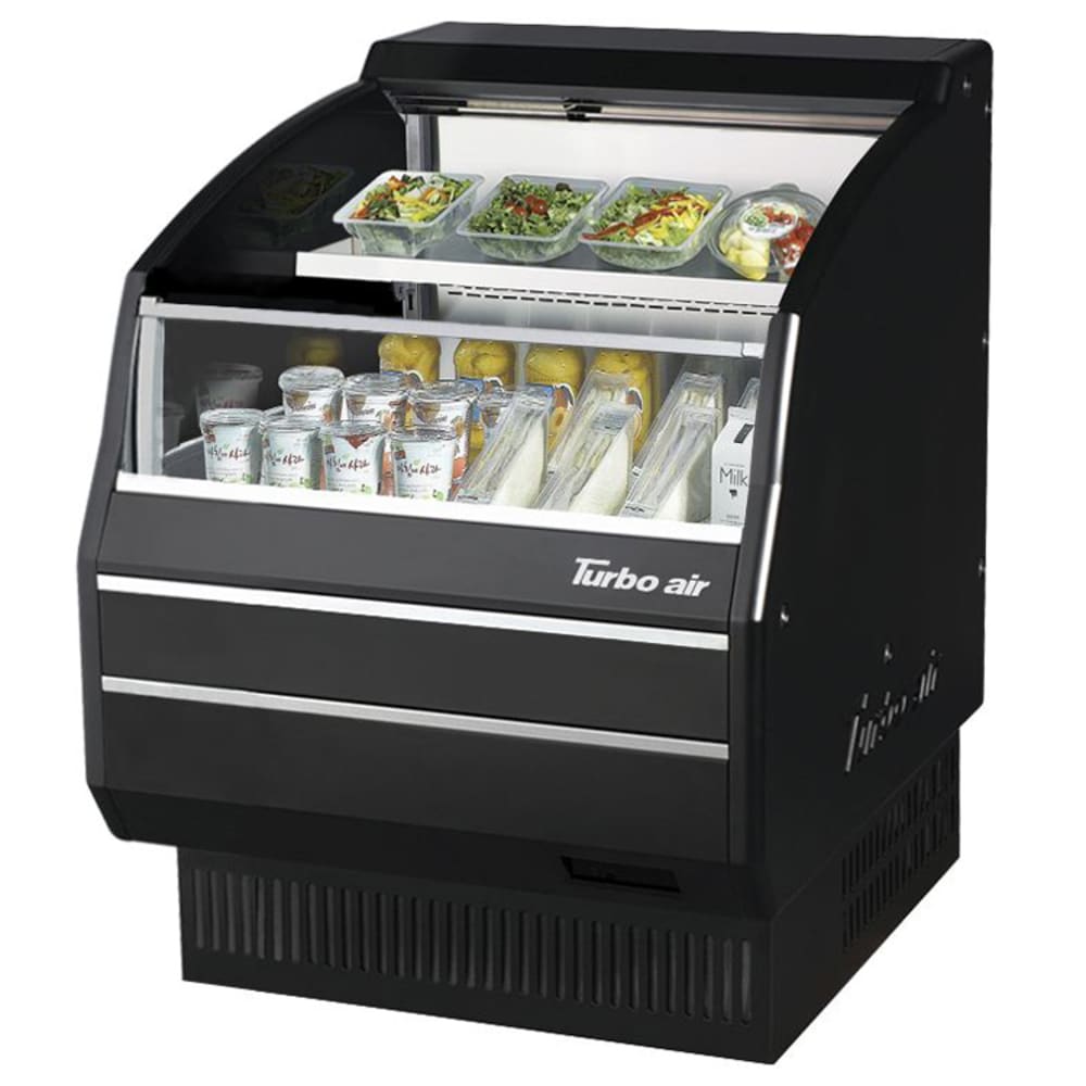 Ideal for displaying packaged meats, cheeses, sandwiches, salads, and other snacks in grocery stores and convenience shops, the Turbo Air TOM-30LB-SP-N horizontal open display merchandiser is a low-profile unit with one 251⁄2-inch-wide by 103⁄4-inch-deep shelf. A safety-reinforced tempered glass front shield secures drinks and foods in place while ensuring customers have a full view of available items. To grab customer attention, LED lighting built beneath the shelf illuminates displayed product, while the contemporary, European-style body is accented with a stainless steel interior to enhance food displays and ease cleaning. This black unit measures 281⁄8 inches wide by 343⁄4 inches deep by 461⁄2 inches high for flexibility in installation locations. It's positioned on 5⁄8-inch bolts that can be raised to 23⁄4 inches for stabilization on sloped or irregular flooring.
